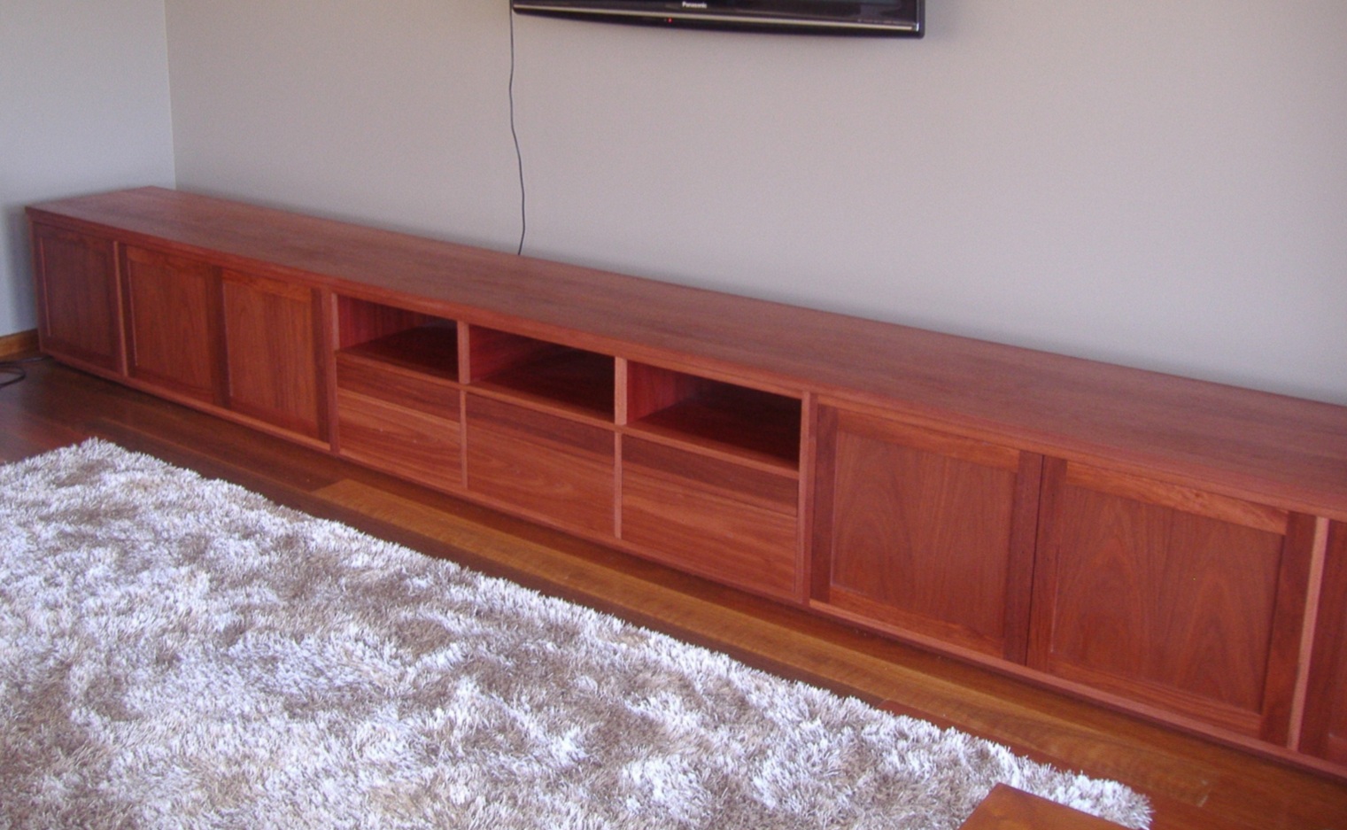 4.5 METER BLACKWOOD ENTERTAINMENT UNIT. 4.5 Meter three piece Blackwood entertainment unit, with one piece solid top.